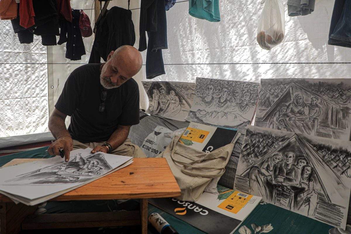 El Makusi çadırlarda yaşayan yerinden edilmiş aileleri birbiri ardına eskiz defterinin sayfalarına resmediyor.