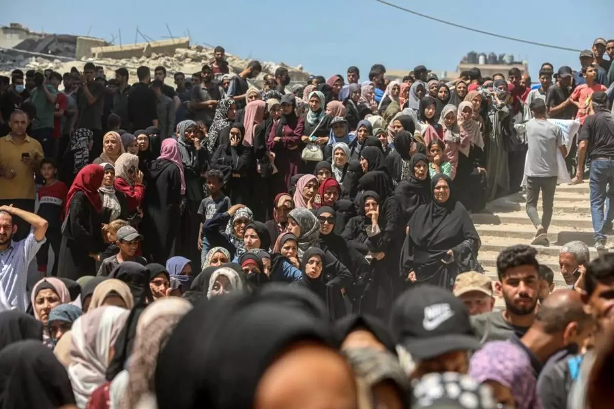 GAZZE, 27 Haziran (Xinhua) — Gazzeliler, gıda paketleri ve un çuvalları almak için yardım dağıtım noktalarında uzun kuyruklar oluşturdu.