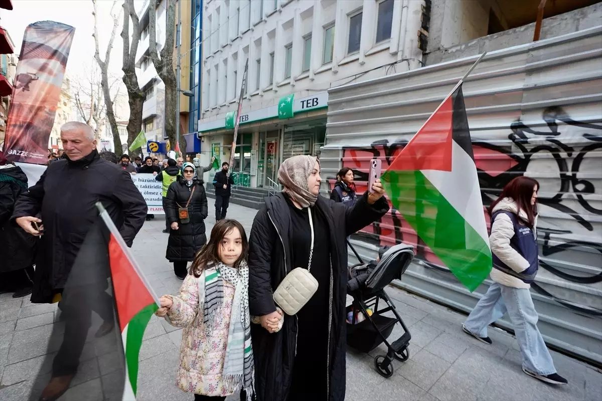 İkindi namazının ardından Maarifi Sultan Camisi’nin bahçesinde toplanan grup, tekbir getirip “Nehirden denize özgür Filistin”, “Aksa Tufanı onurumuzdur” yazılı pankart açtı.