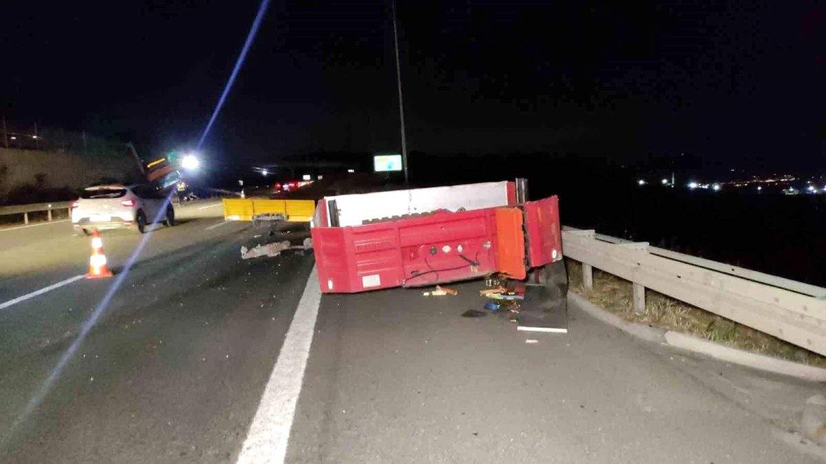 Kaza, saat 21.00 sıralarında Gebze-Orhangazi-İzmir Otoyolu Gemlik Serbest Bölge kavşağı yakınlarında meydana geldi. Alınan bilgilere göre, Bursa istikametinden İstanbul istikametine doğru gitmekte olan Selami Tekdur (60) idaresindeki 34 ZJ 1065 plakalı tır, sürücünün kontrolünden çıkarak karşı şeride uçtu. Arkasında çift dorse takılı bulunan tır, refüjde yaklaşık 3 metre yüksekte ters şekilde askıda kaldı. Tırın arkasında bulunan çift dorse ise karşı şeride savruldu. Dorselerin parçalarının savrulduğu yolda o sırada araç olmaması muhtemel bir faciayı önledi. Tır sürücüsü Selami Tekdur, ters dönüp askıda kalan tırın içinde kazayı hafif sıyrıklarla atlattı. Sürücü, araçtan diğer araç sürücülerinin yardımı ile çıktı.