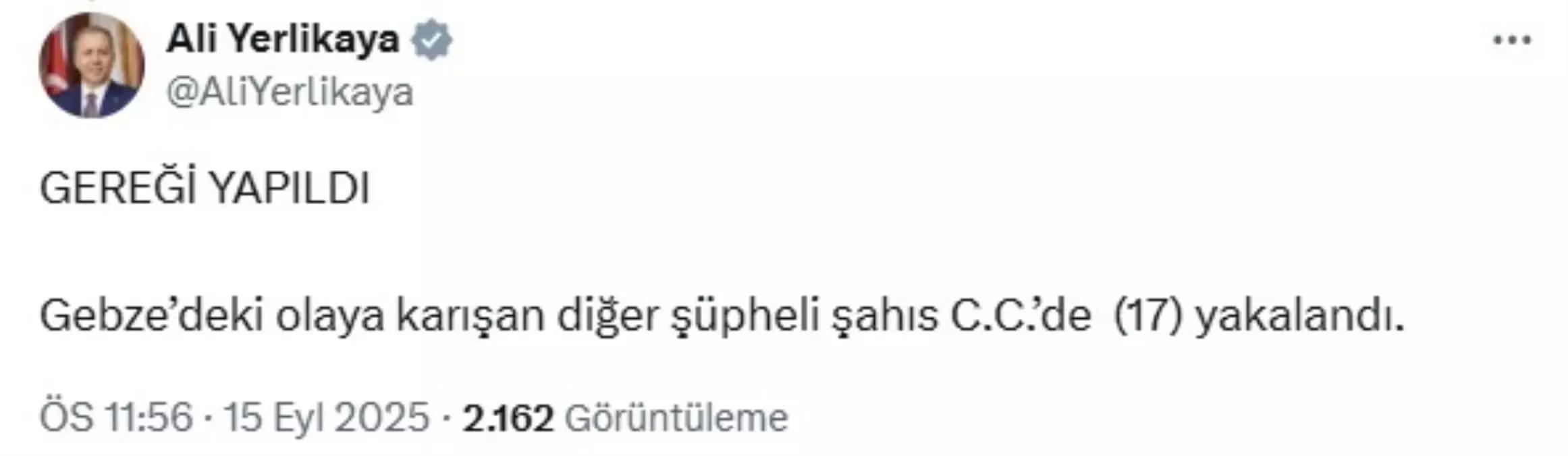 İçişleri Bakanı Yerlikaya, Gebze'deki olaya karışan 17 yaşındaki C.C.'nin yakalandığını duyurdu.
