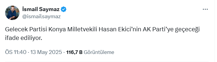 “Gelecek Partisi Konya Milletvekili Hasan Ekici’nin AK Parti’ye geçeceği ifade ediliyor”