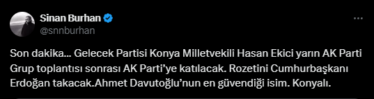 “Gelecek Partisi Konya Milletvekili Hasan Ekici yarın AK Parti Grup toplantısı sonrası AK Parti’ye katılacak. Rozetini Cumhurbaşkanı Erdoğan takacak. Ahmet Davutoğlu’nun en güvendiği isim. Konyalı.”