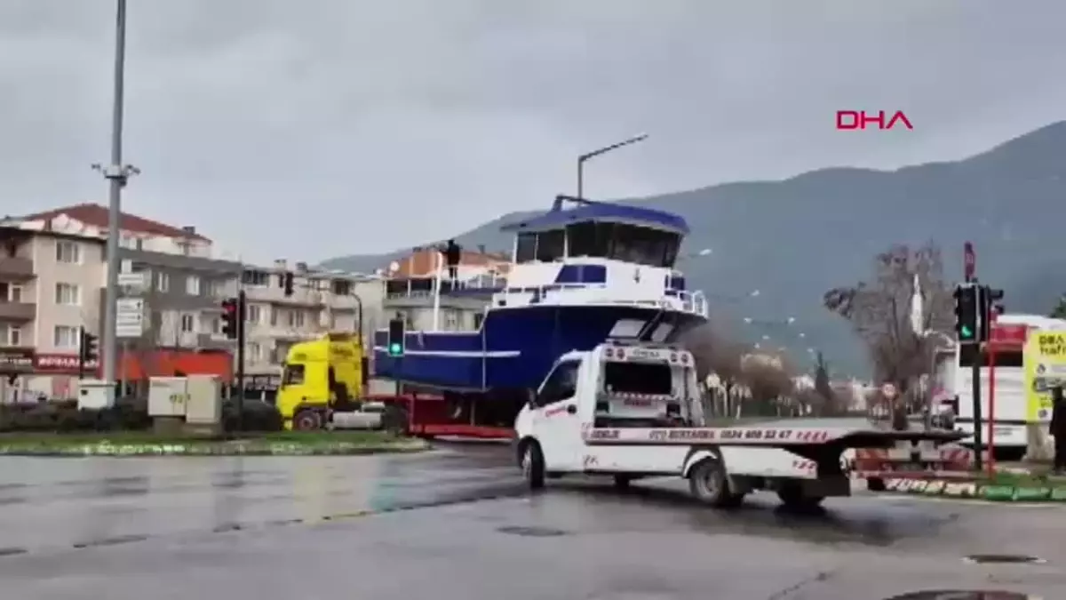 BURSA’nın Gemlik ilçesinde balıkçı teknesi, TIR’ın dorsesinde limana taşındı. Tekneyle caddeden geçen TIR, çevredekiler tarafından cep telefonuyla kayda alındı.