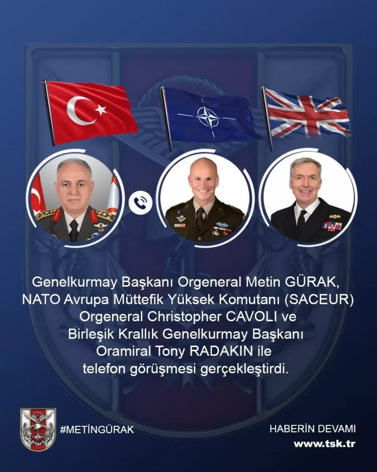 GENELKURMAY Başkanı Orgeneral Metin Gürak, NATO Avrupa Müttefik Yüksek Komutanı (SACEUR) Orgeneral Christopher Cavoli ve Birleşik Krallık Genelkurmay Başkanı Oramiral Tony Radakin ile telefonda görüştü.