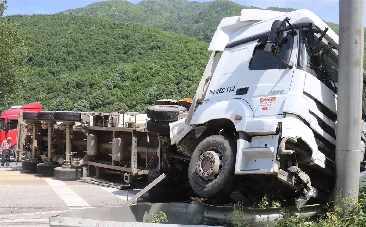 Sakarya’nın Geyve ilçesinde hafif ticari araçla çarpıştıktan sonra devrilen tır, ulaşımda aksamaya neden oldu.