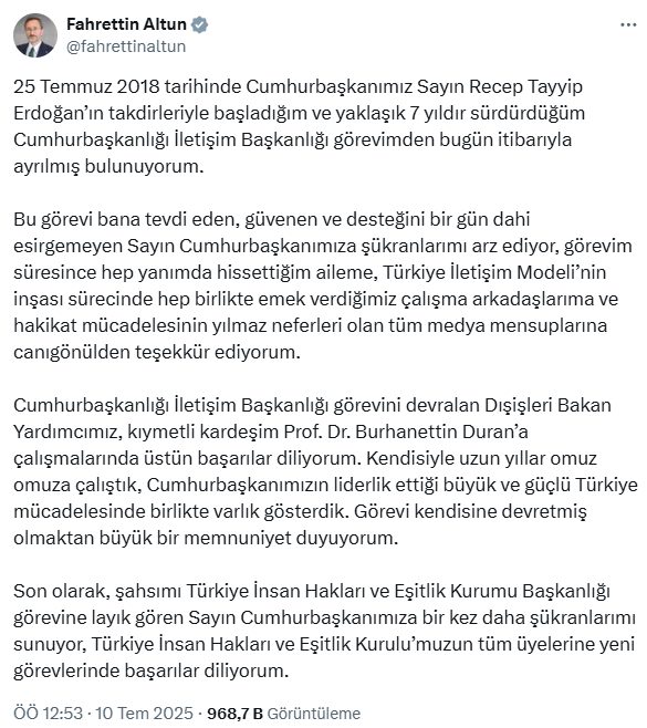 Altun görevden alınmasının ardından sosyal medya hesabından açıklamada bulundu. Erdoğan’a teşekkür eden Altun şu ifadeleri kullandı; “25 Temmuz 2018 tarihinde Cumhurbaşkanımız Sayın Recep Tayyip Erdoğan’ın takdirleriyle başladığım ve yaklaşık 7 yıldır sürdürdüğüm Cumhurbaşkanlığı İletişim Başkanlığı görevimden bugün itibarıyla ayrılmış bulunuyorum.