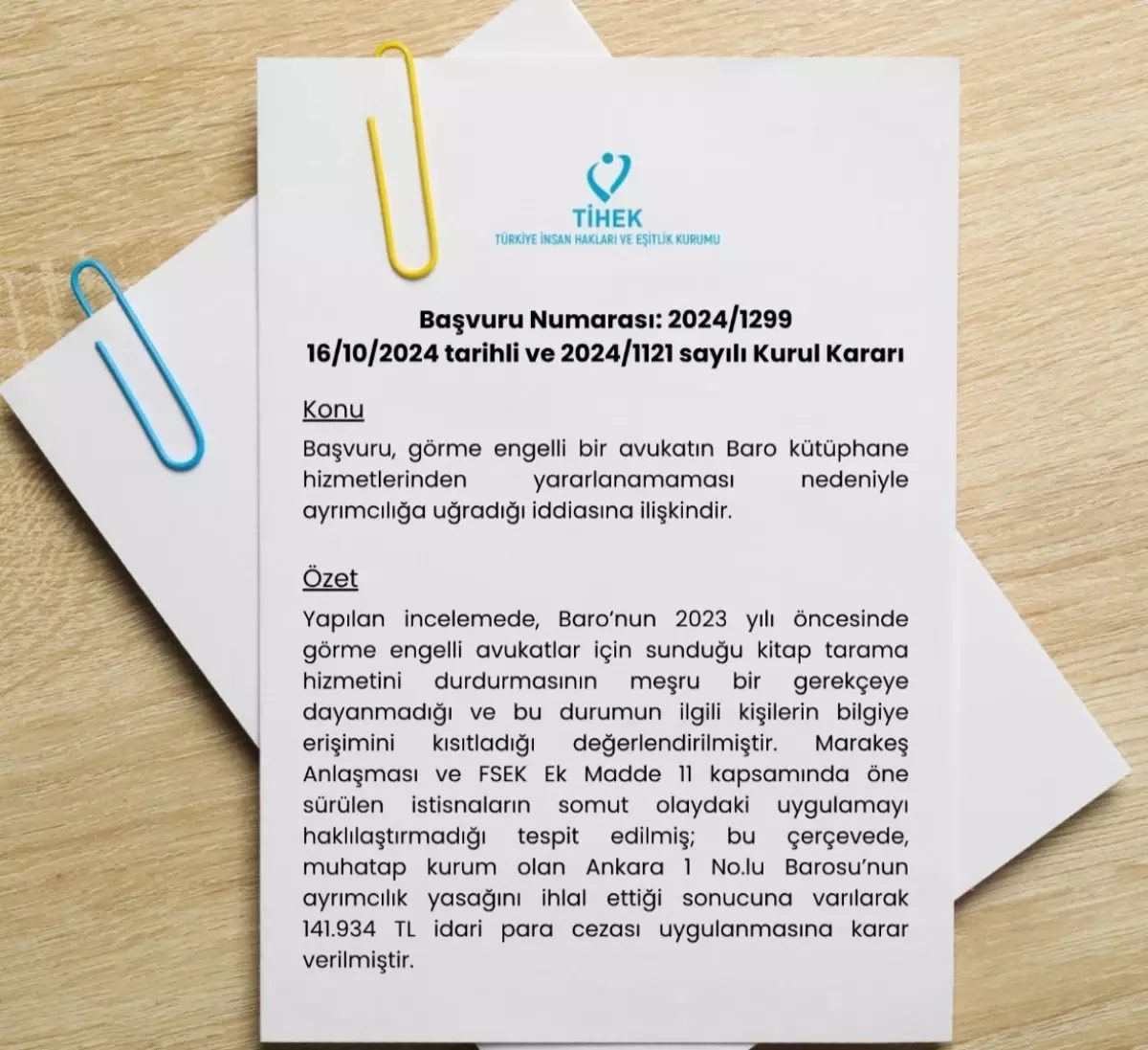 Görme engelli Avukat Olgun Yılmaz, Ankara 1 No’lu Barosu’na ait kütüphaneden, görme engelliler için sunulan kitap tarama ve okuma hizmetinin 2023 yılında durdurulması nedeniyle yararlanamayınca TİHEK’e başvuruda bulundu. Yılmaz, kütüphanede ayrımcılık yapıldığını belirterek, ihlalin giderilmesini talep etti. TİHEK, baronun bu hizmeti durdurmasının meşru bir gerekçeye dayanmadığından kişilerin bilgiye ulaşımının kısıtlandığını değerlendirdi. Baronun ayrımcılık yasağını ihlal etmediğini kanıtlayamadığı ve bu nedenle ayrımcılık yasağının ihlal edildiği kanaatine varıldı. Baroya, 6701 Sayılı Türkiye İnsan Hakları ve Eşitlik Kurumu Kanunu’nda yer alan ayrımcılık yasağını ihlal ettiği gerekçesiyle en üst sınırdan 141 bin 934 TL idari para cezası uygulanmasına karar verildi.
