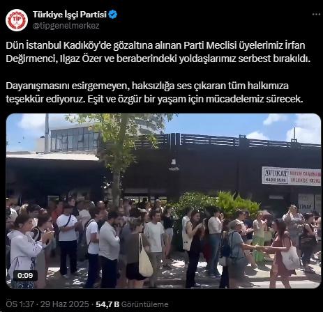 TİP’ten konuyla ilgili yapılan açıklamada Değirmenci ile beraberindekilerin serbest bırakıldığı aktarıldı Açıklamada, “Dün İstanbul Kadıköy’de gözaltına alınan Parti Meclisi üyelerimiz İrfan Değirmenci, Ilgaz Özer ve beraberindeki yoldaşlarımız serbest bırakıldı. Dayanışmasını esirgemeyen, haksızlığa ses çıkaran tüm halkımıza teşekkür ediyoruz. Eşit ve özgür bir yaşam için mücadelemiz sürecek” ifadelerine yer verildi.