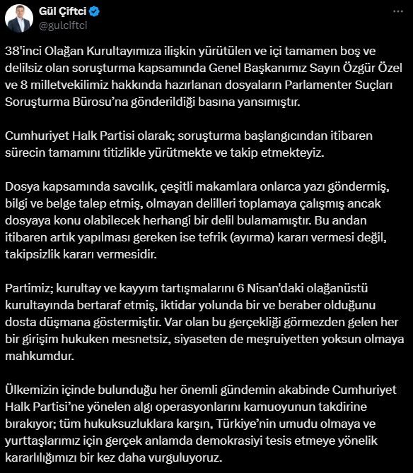 CHP Seçim ve Parti Hukuk İşlerinden Sorumlu Genel Başkan Yardımcısı Gül Çiftçi, sosyal medya hesabından yaptığı açıklama ile savcılığın ayırma kararına sert tepki gösterdi.