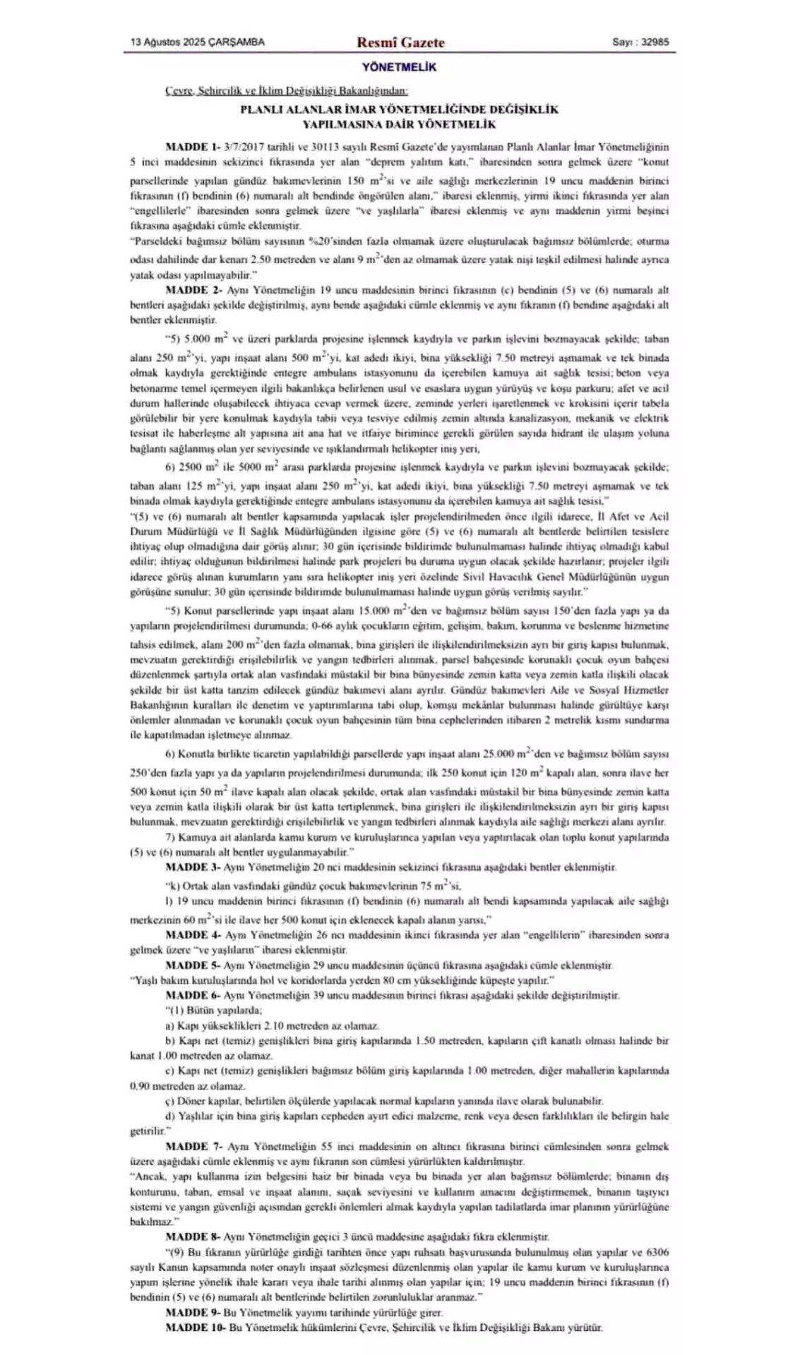 Bakan Göktaş, sosyal medya hesabından yaptığı paylaşımda Aile Yılı’nda güçlü adımlar atmaya devam ettiklerini belirterek, “Planlı İmar Yönetmeliği’nde yapılan değişiklikle 150’den fazla konut bulunan projelerde 0-66 aylık çocuklarımızın eğitim, gelişim, bakım, korunma ve beslenme ihtiyaçlarını karşılayacak gündüz bakımevlerinin açılmasını zorunlu hale getiren yönetmelik Resmi Gazete’de yayımlandı” ifadelerini kullandı.