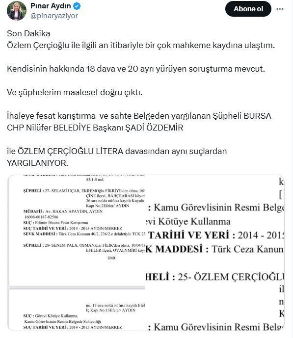Gazeteci Pınar Aydın, Çerçioğlu hakkında yaklaşık 20 ayrı suç dosyası soruşturmasının yürütüldüğünü öne sürdü. İddialara göre Çerçioğlu’na yöneltilen suçlamalar arasında ihalelerde usulsüzlük, görevi kötüye kullanma gibi başlıklar bulunuyor.