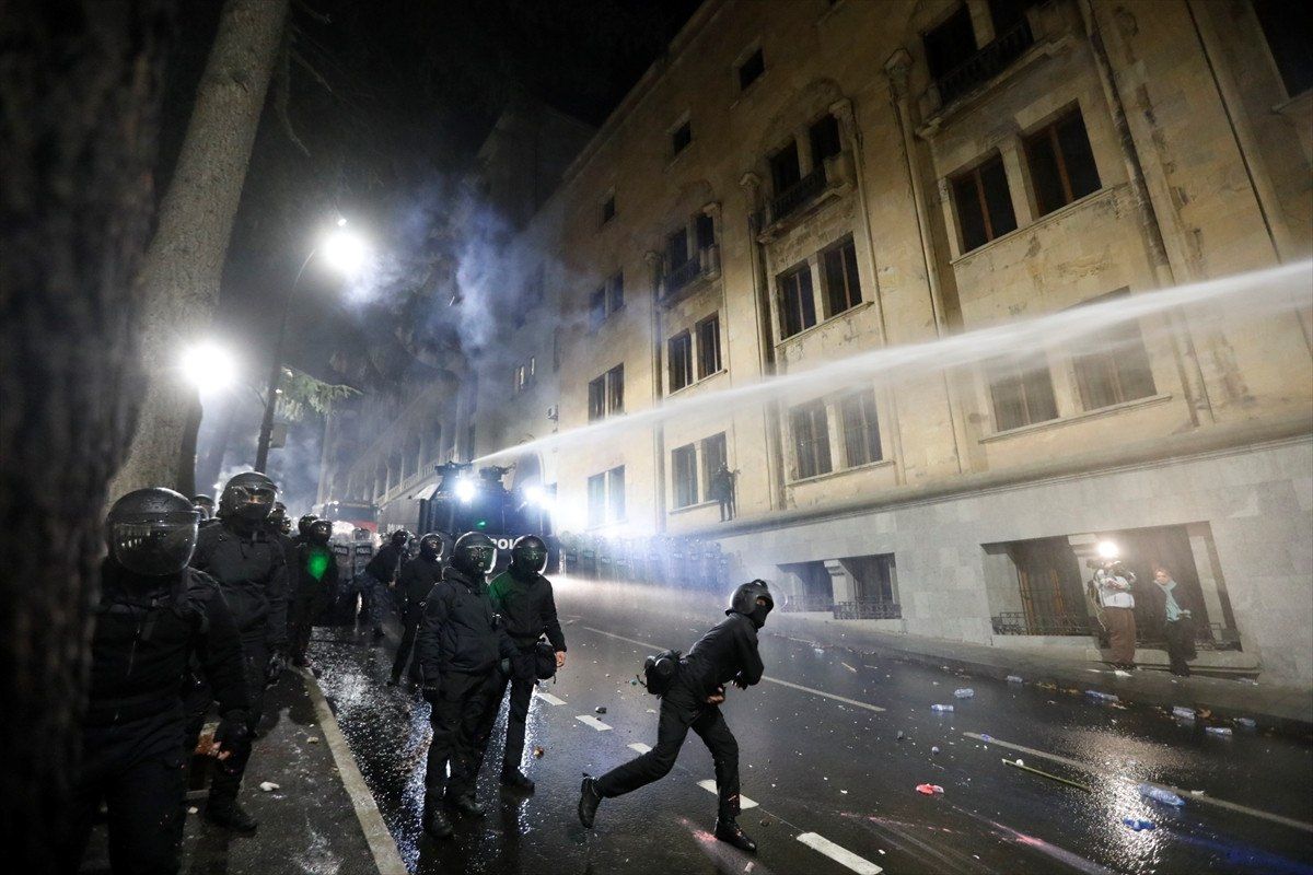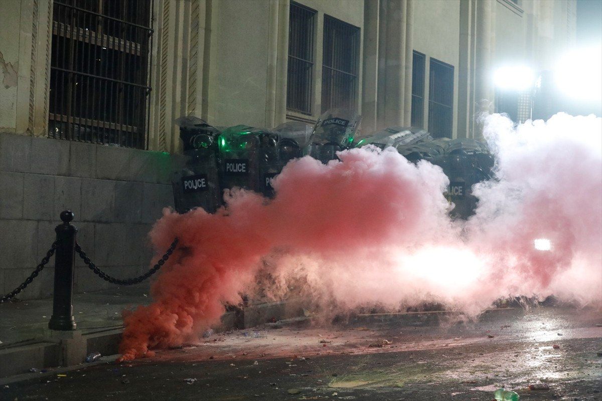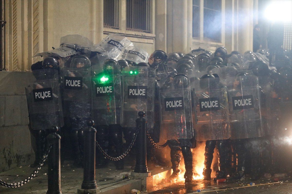 Başkent Tiflis’teki parlamento binası önünde toplanan protestocular, taş ve yabancı maddelerle demir barikatları hedef aldı.