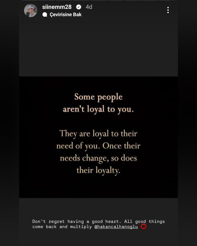 Olay tepkilerin ardından Hakan Çalhanoğlu’nun eşi Sinem Çalhanoğlu, sosyal medyadan paylaşım yaptı. Hakan Çalhanoğlu’nu sosyal medya paylaşımına etiketleyen Sinem Çalhanoğlu “İyi bir kalbe sahip olduğun için pişman olma! Tüm iyi şeyler geri döner ve katlanarak çoğalır. Sana değil sana olan ihtiyaçlarına sadıklar. İhtiyaçları değiştiğinde sadakatleri de değişir” ifadelerini kullandı.