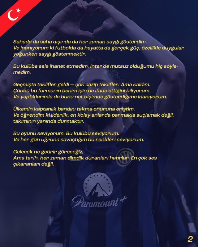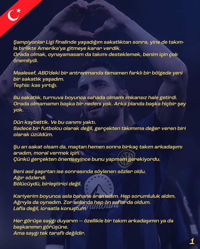 Transfer döneminde Galatasaray ile adı sıkça anılan Inter forması giyen Hakan Çalhanoğlu, geçtiğimiz gece mağlubiyet sonrası takım arkadaşı Lautaro Martinez’in kendisini hedef alan açıklamalarına karşın sosyal medya hesabından paylaşım gerçekleştirdi.
