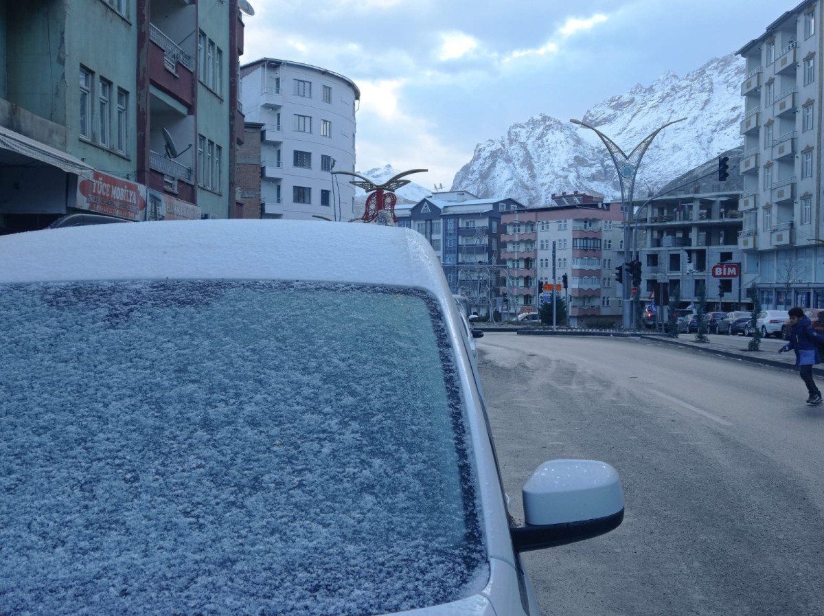 Kentte dağlar beyaza bürünürken, gece hava sıcaklığının sıfırın altına düşmesiyle araçların camları da buz tuttu.