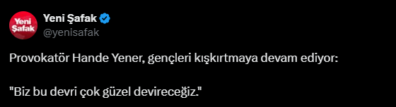Hande Yener’in bu sözleri seyirciler tarafından alkışlarla karşılanırken, tepki gösterenler de oldu. İktidara yakınlığıyla bilinen Yeni Şafak gazetesi Hande Yener’i hedef aldı. Hande Yener’in sahne kıyafetini sansürleyen Yeni Şafak, o görüntüleri “Provokatör Hande Yener gençleri kışkırtmaya devam ediyor” başlığıyla servis etti.