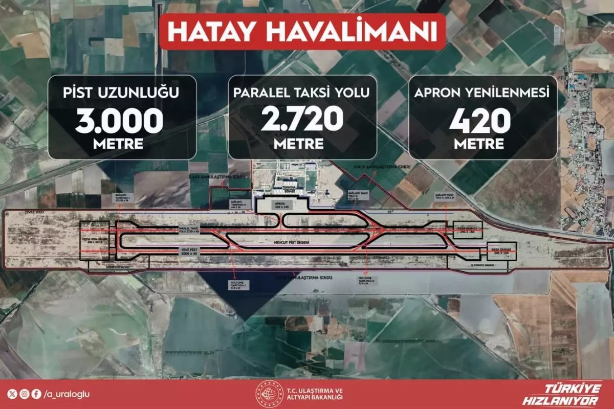 Bakan Uraloğlu, eylül ayında 2 bin 720 metre uzunluğundaki yeni yardımcı pistin ve 10 uçak kapasiteli apronun hizmete alınacağını belirterek, “Söz konusu pistle apron geçişini sağlayacak bağlantı taksi yolu, yeni regülatör ve ısı merkezi binalarını da tamamlayarak hizmete alacağız. Böylece, Hatay Havalimanımızın operasyon kapasitesi artacak, hava trafiğine uygun olan saat aralıkları uzatılacak, park kapasitesine bağlı olarak sefer sayısı da artırılabilecek” ifadelerini kullandı.