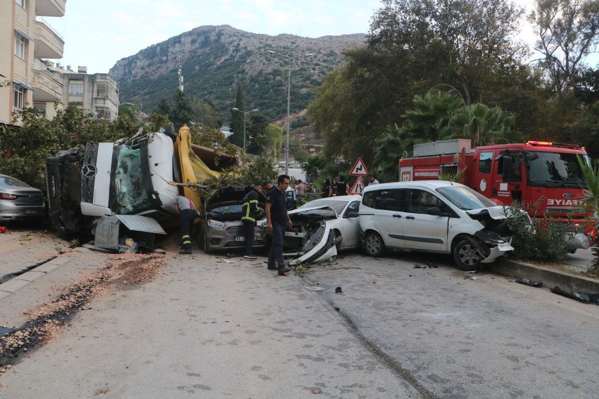 Defne ilçesi Harbiye Mahallesi’nde ilerlediği sırada fren sisteminde arıza yaşanan kum yüklü hafriyat kamyonu, seyir halindeki ve park halindeki toplam 9 araca çarptı.