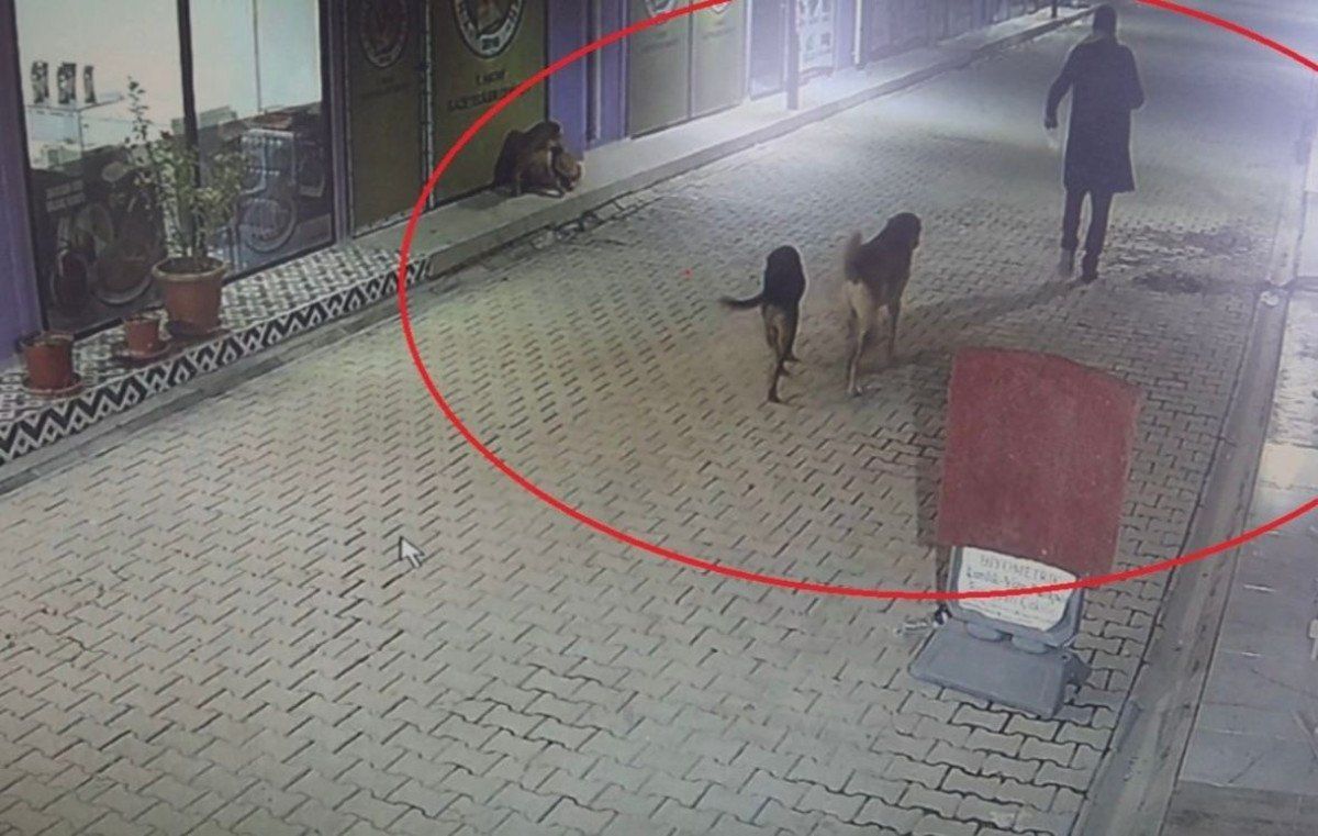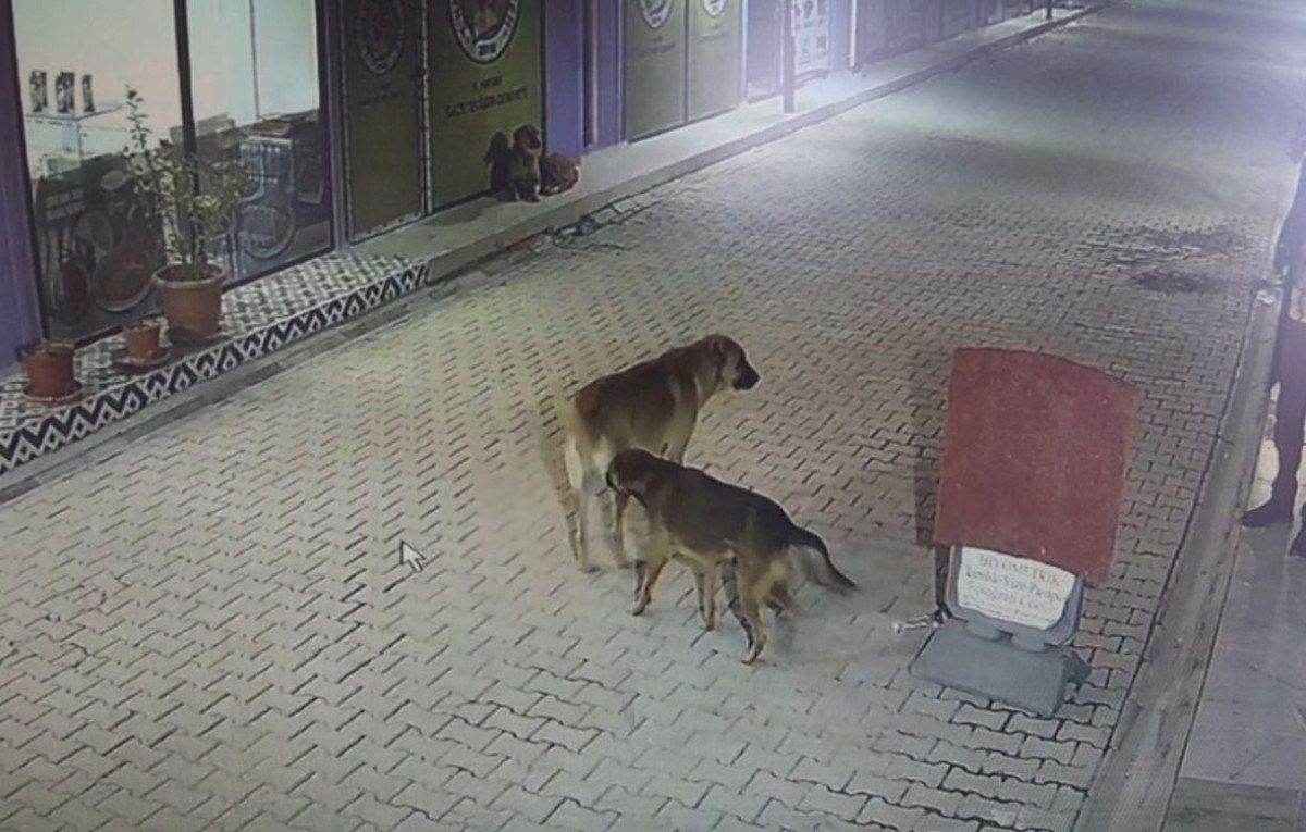 Güvenlik kamerası görüntülerini izleyen esnaf, kimliği belirsiz bir kişinin yanında 3 sokak köpeğiyle geldiğini ve iş yerlerinin etrafında dolaştığını gördü.