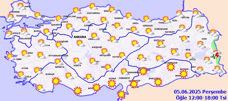 Meteoroloji Genel Müdürlüğü tarafından yapılan tahminlere göre: yurdun doğu kesimlerinin yer yer çok bulutlu, Van’ın doğu kesimlerinin yerel sağanak ve gök gürültülü sağanak yağışlı, diğer yerlerin parçalı ve az bulutlu geçeceği tahmin ediliyor.