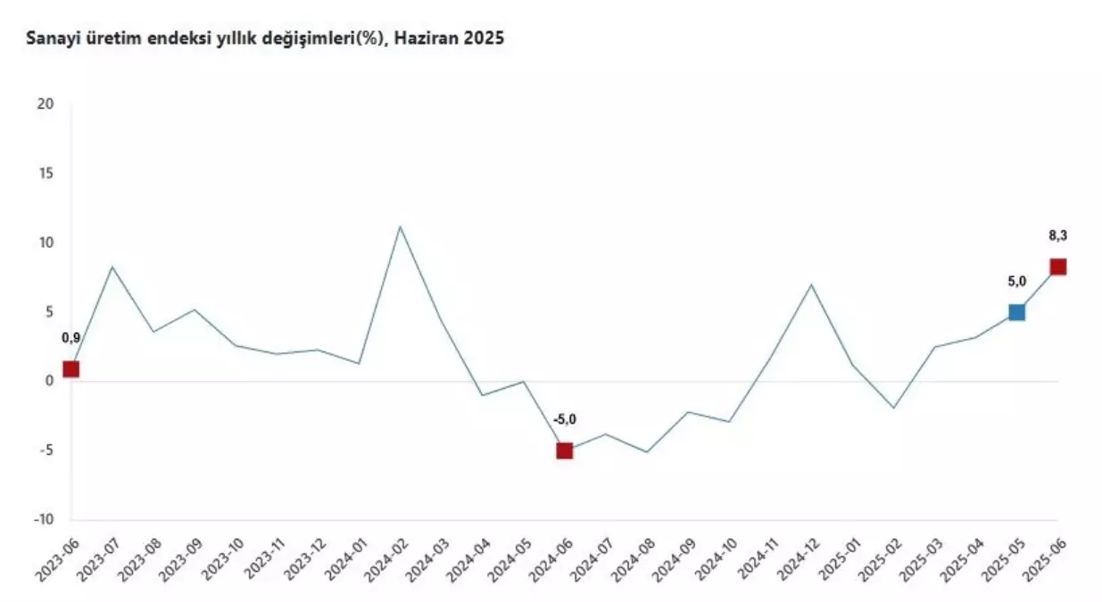 TÜİK, Haziran 2025 dönemine ilişkin sanayi üretim endeksi verilerini açıkladı. Buna göre; sanayi üretimi bir önceki yılın aynı ayına göre yüzde 8,3 arttı. Sanayinin alt sektörleri incelendiğinde, madencilik ve taş ocakçılığı sektörü endeksi bir önceki yılın aynı ayına göre yüzde 2,3 arttı, imalat sanayi sektörü endeksi yüzde 9,5 arttı ve elektrik, gaz, buhar ve iklimlendirme üretimi ve dağıtımı sektörü endeksi yüzde 1,1 azaldı.