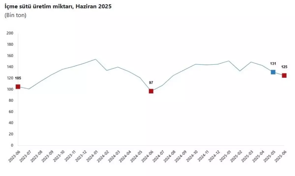 Bir önceki ay 999 bin 348 ton olan ticari süt işletmelerince toplanan inek sütü miktarı, haziran ayında yüzde 6,5 oranında azalarak 934 bin 745 ton oldu. Bir önceki ay 131 bin 232 ton olan içme sütü üretimi de haziran ayında yüzde 4,9 oranında azalarak 124 bin 852 ton olarak gerçekleşti. Ticari süt işletmeleri tarafından toplanan inek sütü miktarı, haziran ayında bir önceki yılın aynı ayına göre yüzde 0,9 arttı, ocak-haziran döneminde bir önceki yılın aynı dönemine göre yüzde 0,8 arttı. Haziran ayında bir önceki yılın aynı ayına göre, inek peyniri üretimi yüzde 5,4 arttı, ayran ve kefir üretimi yüzde 11,7 arttı, yoğurt üretimi yüzde 2,6 arttı, içme sütü üretimi yüzde 28,7 arttı, tereyağı ve sadeyağ üretimi yüzde 18,8 arttı. Ocak-haziran döneminde bir önceki yılın aynı dönemine göre, inek peyniri üretimi yüzde 1,8 arttı, ayran ve kefir üretimi yüzde 7,6 arttı, yoğurt üretimi yüzde 3,8 arttı, içme sütü üretimi yüzde 6,9 arttı, tereyağı ve sadeyağ üretimi yüzde 11,2 arttı.