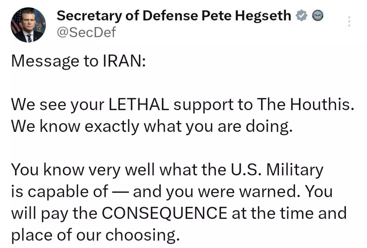 ABD Savunma Bakanı Hegseth, İran'ın Husilere desteğinin sonuçlarına katlanacağını belirtti.