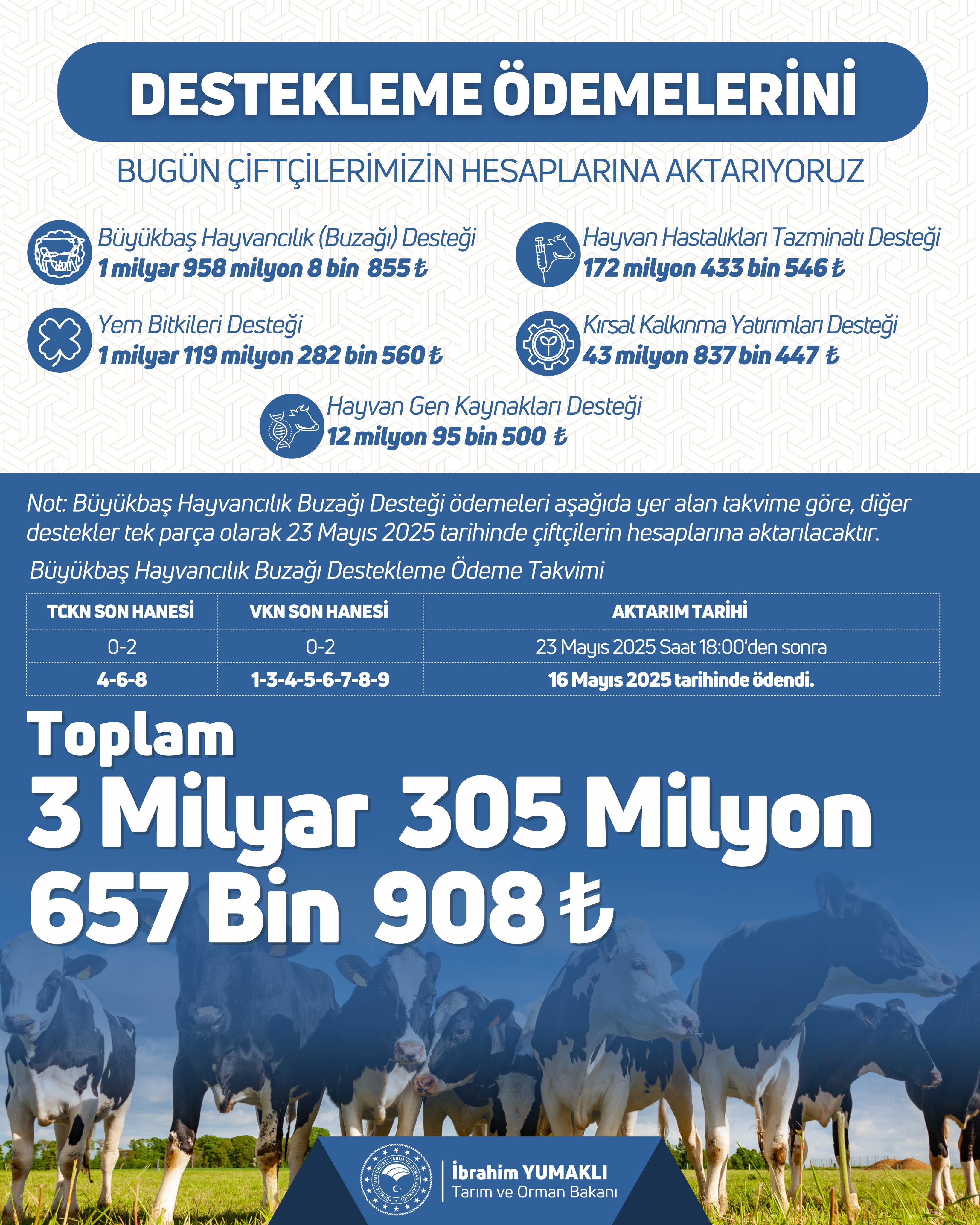 Bakan Yumaklı, toplam 3 milyar 305 milyon 657 bin TL’lik hayvancılık destekleme ödemelerinin hesaplara aktarılmaya başlandığını açıkladı.