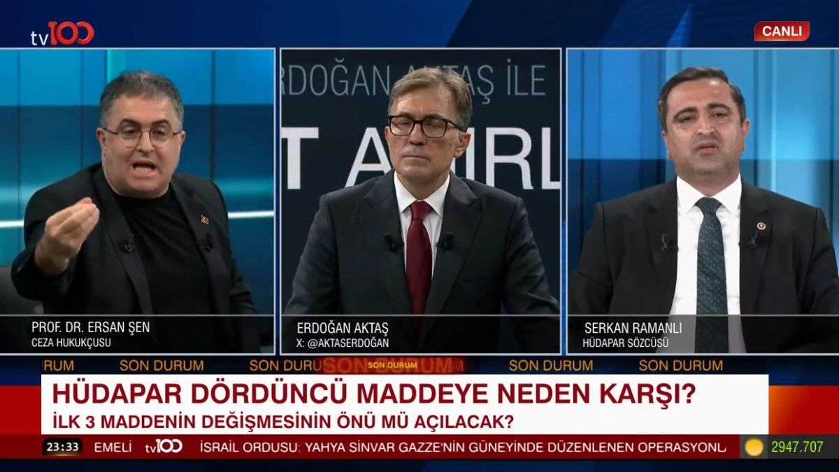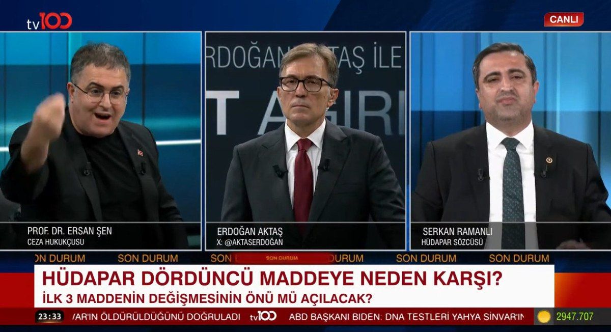 tv100’ün Erdoğan Aktaş ile Eşit Ağırlık programında bu akşam Bolu Belediye Başkanı Tanju Özcan, HÜDA-PAR Genel Başkan Yardımcısı Serkan Ramanlı ve hukukçu Ersan Şen’in konuşmaları gündem oldu.