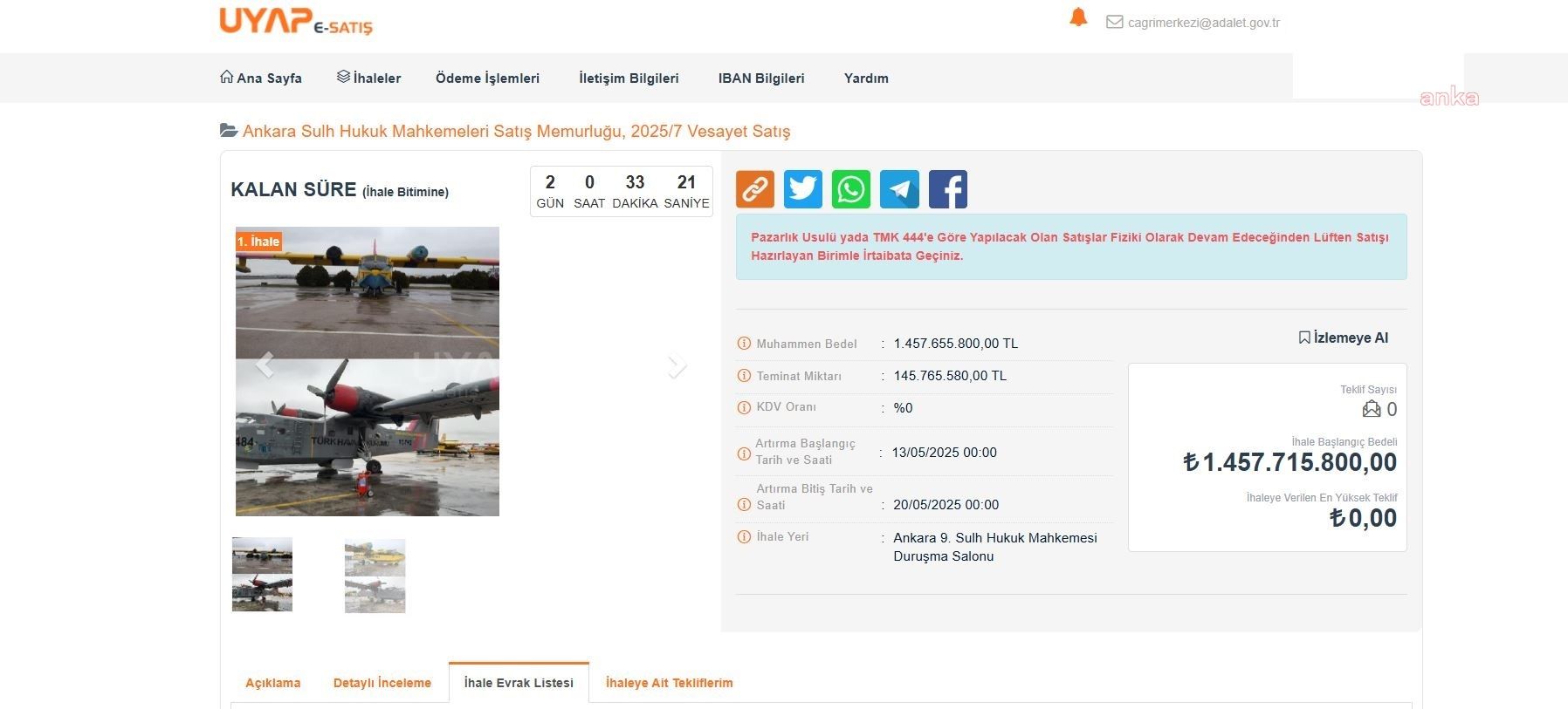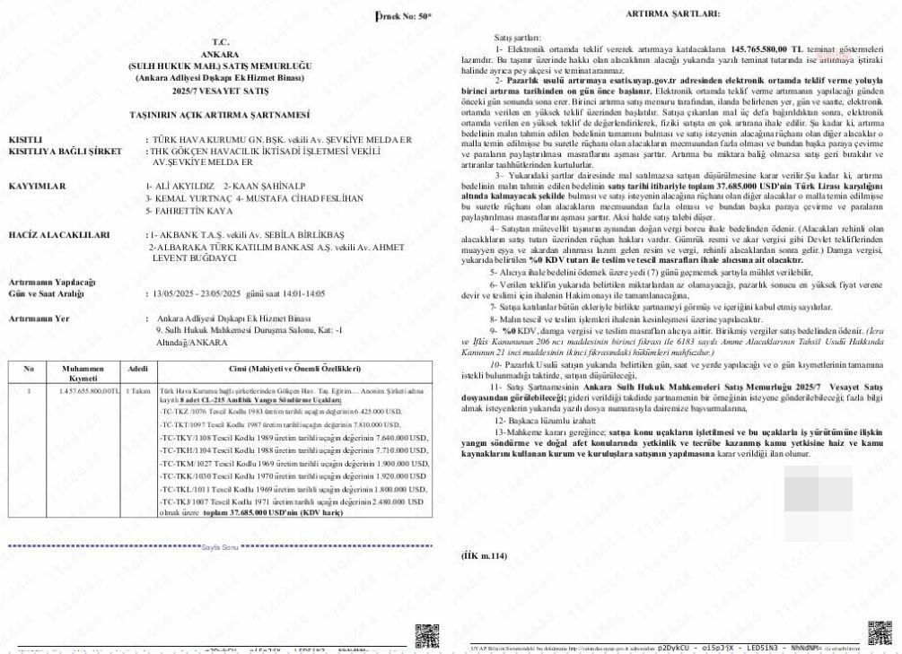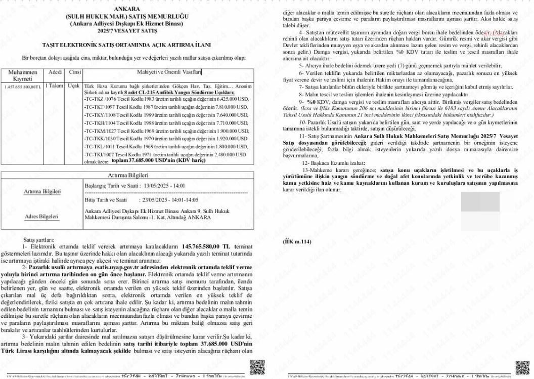 Mustafa Kemal Atatürk tarafından 16 Şubat 1925 tarihinde kurulan Türk Hava Kurumu (THK), 2019 yılından bu yana kayyumlar tarafından yönetiliyor. Türk Hava Kurumu’na ait 8 adet Amfibik Yangın Söndürme uçağının UYAP-E Satış Portalı üzerinden satışa çıkarıldığı ortaya çıktı. Ankara Sulh Hukuk Mahkemeleri Satış Memurluğu, 2025/7 Vesayet Satış ile yapılan satışta 8 uçak için istenen bedel 1 milyar 457 milyon 715 bin 800 Türk Lirası olarak belirlendi. Türk Hava Kurumu bağlı şirketlerinden Gökçen Havacılık İktisadi İşletmesi Lojistik Anonim Şirketi’ne kayıtlı 8 adet CL-215 Amfibik Yangın Söndürme Uçağı’na ilan süresinin azalmasına rağmen henüz bir teklif verilmedi.