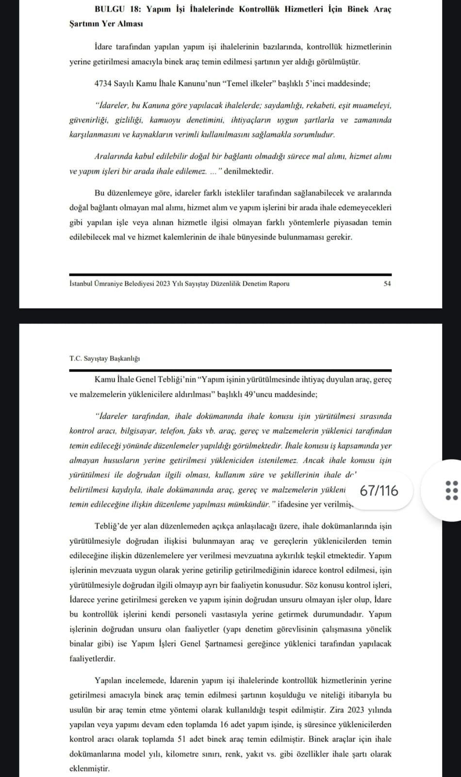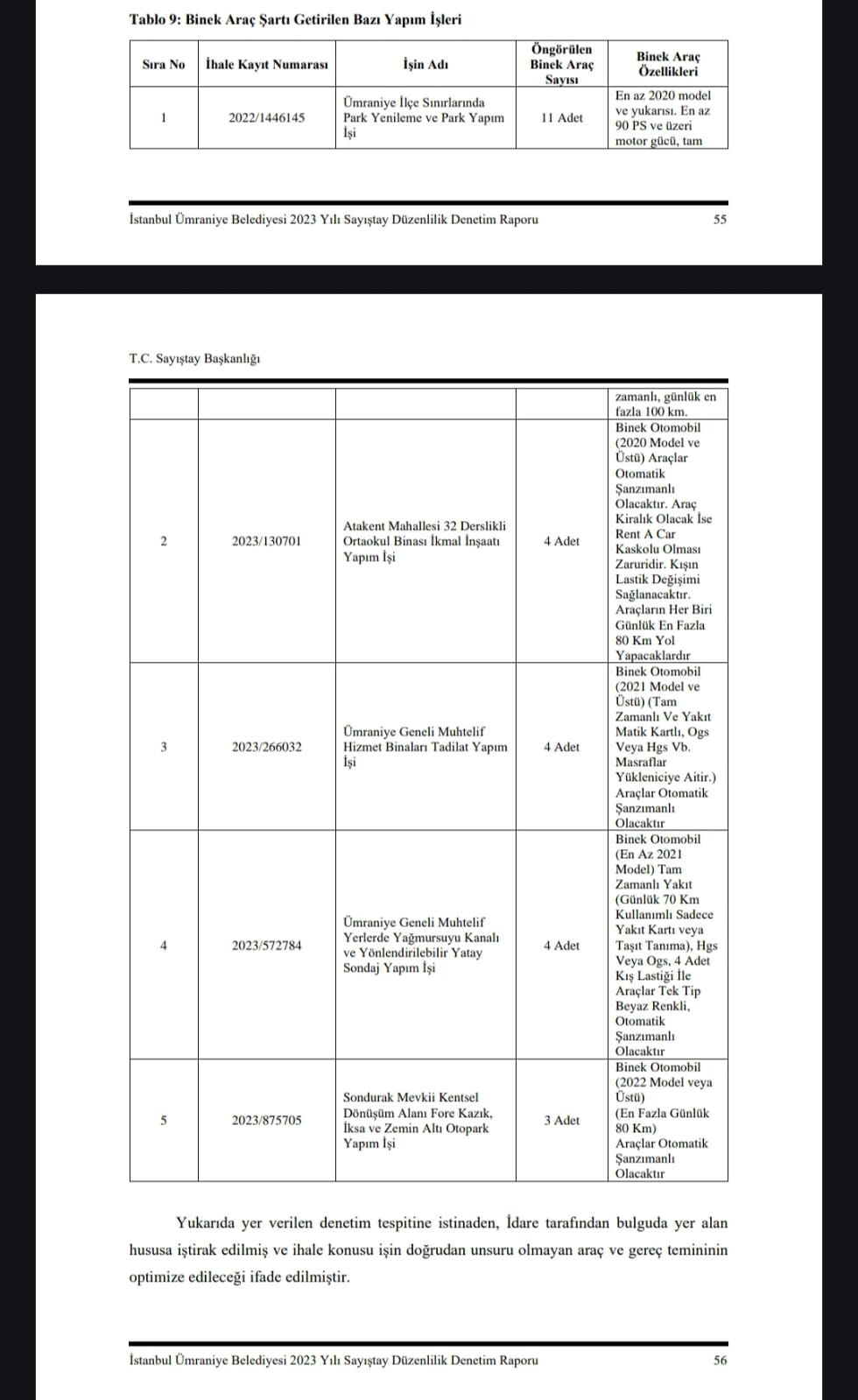 Ümraniye Belediyesi’nin Sayıştay raporunda yazan ihaleler ve talep edilen araçlar şu şekilde: