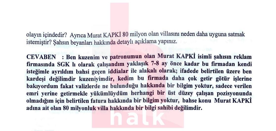Soruşturma dosyasına giren bu iki farklı ifadede villa satışıyla ilgili farklı anlatımlar yer alırken, bir ifadedeki villa üçüncü bir şahsa ait olarak aktarılırdı, diğerinde aynı villa için Murat Kapki’ye aitmiş gibi soru yöneltildi.