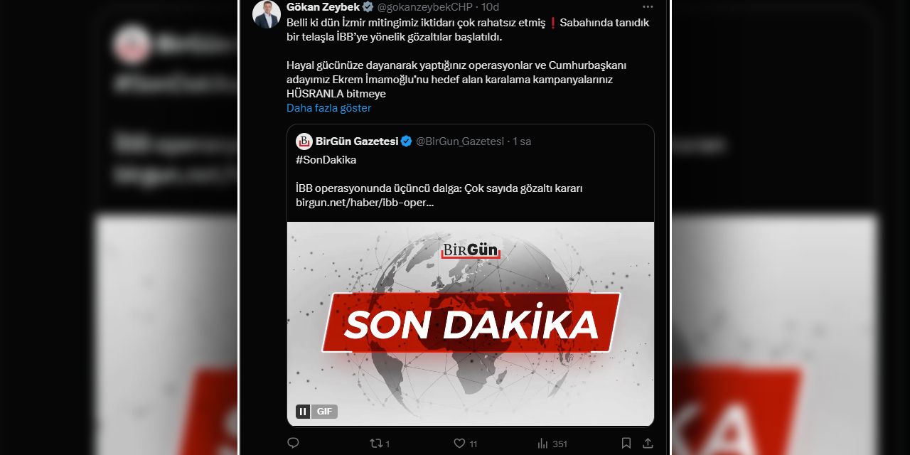 “Belli ki dün İzmir mitingimiz iktidarı çok rahatsız etmişSabahında tanıdık bir telaşla İBB’ye yönelik gözaltılar başlatıldı. Hayal gücünüze dayanarak yaptığınız operasyonlar ve Cumhurbaşkanı adayımız Ekrem İmamoğlu’nu hedef alan karalama kampanyalarınız HÜSRANLA bitmeye mahkum. Yıpratmaya çalıştığınız her hamle, halkın vicdanına çarpıp geri dönüyor Korkuyla yönetemezsiniz. Baskıyla susturamazsınız. Yargıyı kullanarak siyaset yapmaya çalışanlar, bu halkın gözünde artık zerre kadar kıymetiniz yok”
