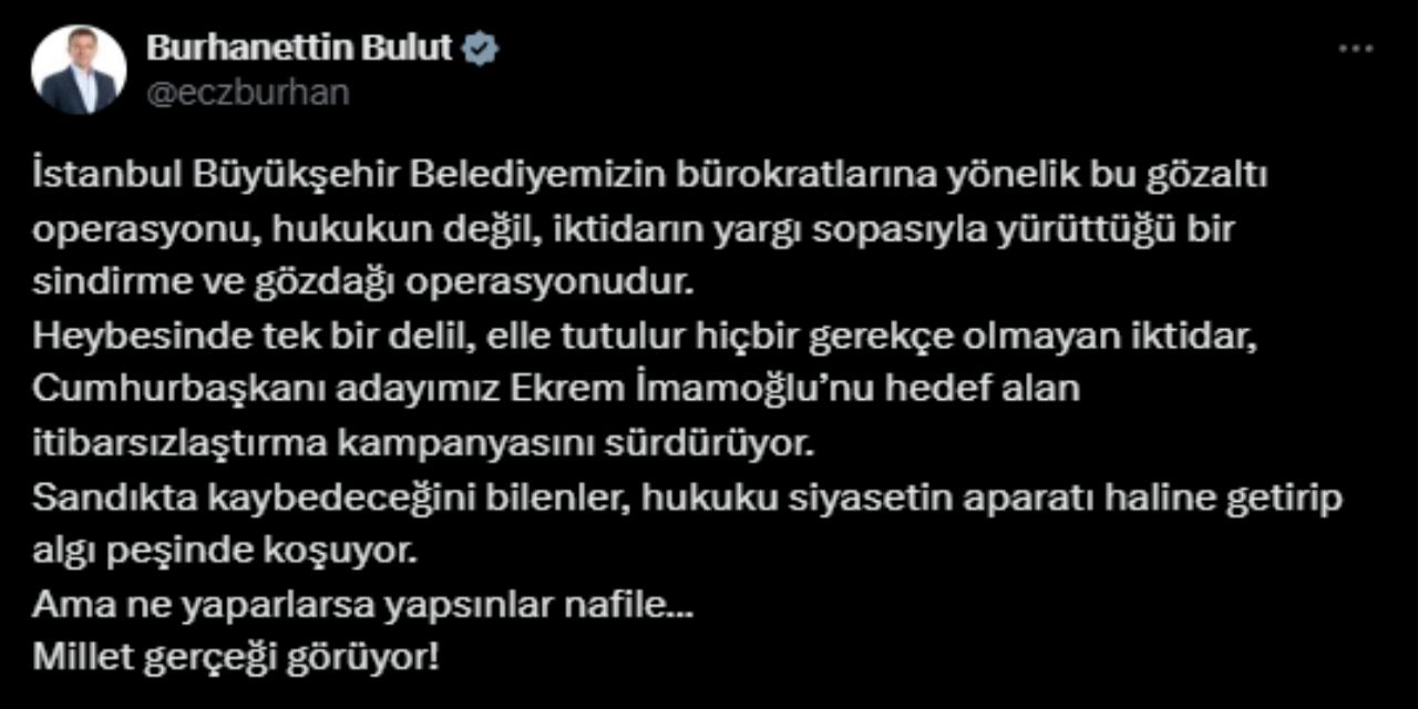Bulut sosyal medya hesabından yaptığı açıklamada iktidarın, cumhurbaşkanı adayı İmamoğlu’nu itibarsızlaştırma kampanyasına devam ettiğini ifade etti:
