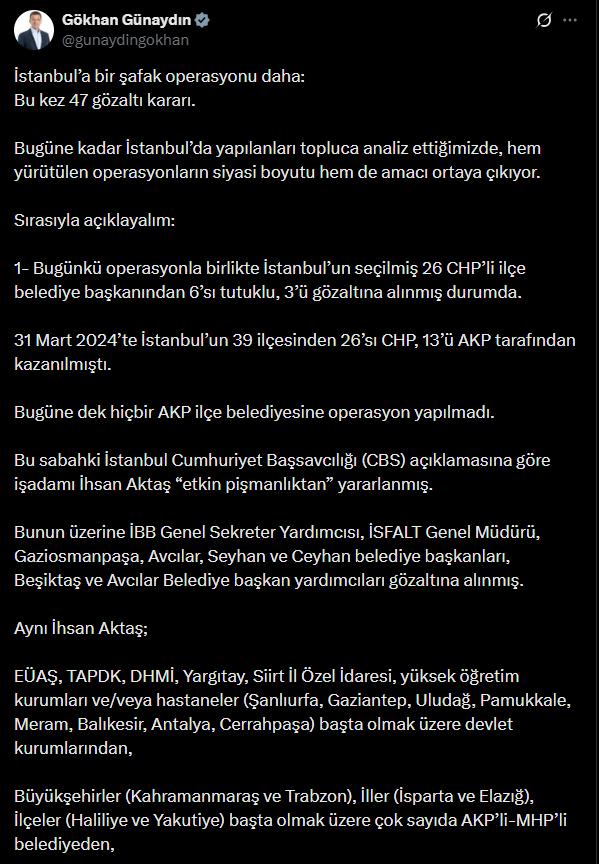 CHP Grup Başkanvekili Gökhan Günaydın, sosyal medya hesabından bir açıklamada bulunarak operasyonların siyasi boyunu ve amacını tek tek sıraladı. Günaydın, “İstanbul’a bir şafak operasyonu daha: Bu kez 47 gözaltı kararı. Bugüne kadar İstanbul’da yapılanları topluca analiz ettiğimizde, hem yürütülen operasyonların siyasi boyutu hem de amacı ortaya çıkıyor.” söyleminde bulunarak şu ifadeleri kullandı: