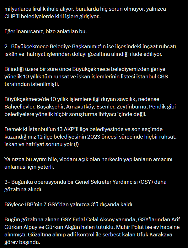 “2- Büyükçekmece Belediye Başkanımız’ın ise ilçesindeki inşaat ruhsatı, iskân ve hafriyat işlerinden dolayı gözaltına alındığı ifade ediliyor.