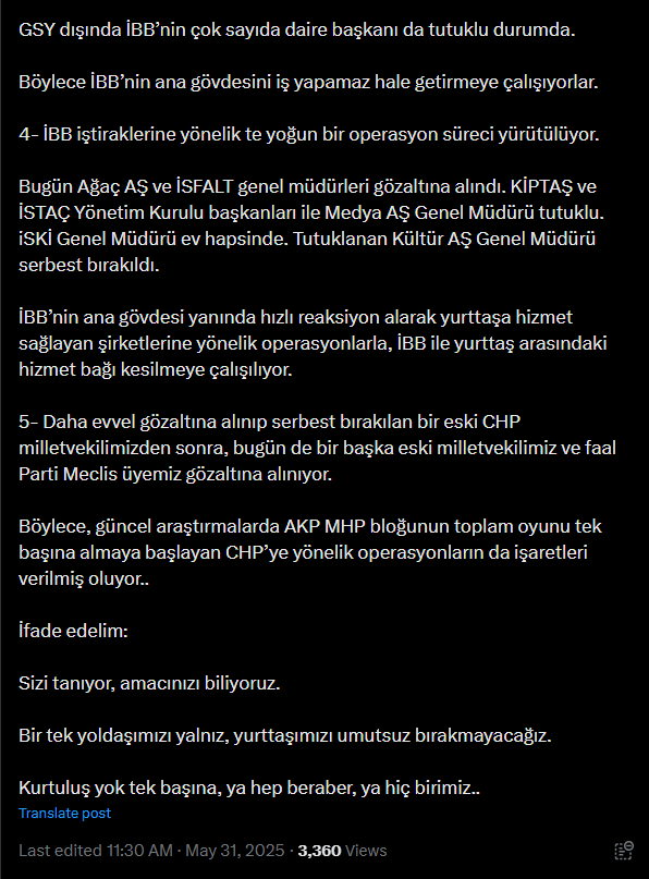 Bugün Ağaç AŞ ve İSFALT genel müdürleri gözaltına alındı. KİPTAŞ ve İSTAÇ Yönetim Kurulu başkanları ile Medya AŞ Genel Müdürü tutuklu. iSKİ Genel Müdürü ev hapsinde. Tutuklanan Kültür AŞ Genel Müdürü serbest bırakıldı.” ifadelerini kullanarak “İBB’nin ana gövdesi yanında hızlı reaksiyon alarak yurttaşa hizmet sağlayan şirketlerine yönelik operasyonlarla, İBB ile yurttaş arasındaki hizmet bağı kesilmeye çalışılıyor.” sözlerini sarf etti.