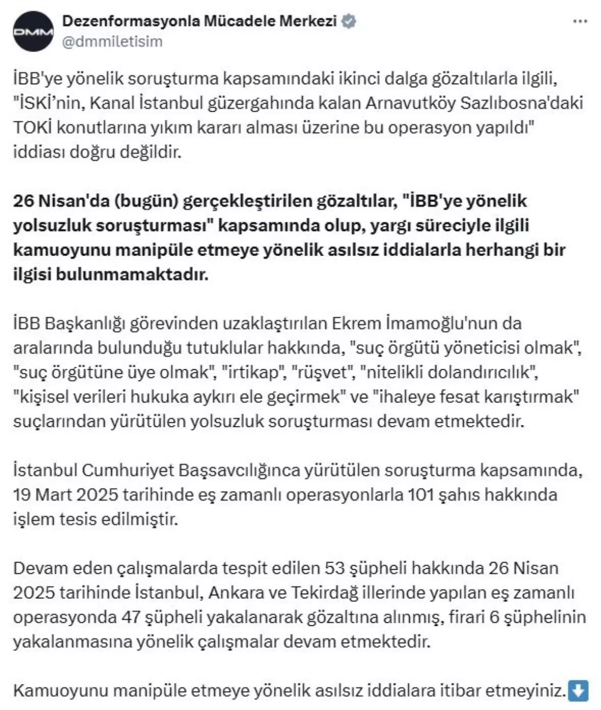 “İBB’ye yönelik soruşturma kapsamındaki ikinci dalga gözaltılarla ilgili, ‘İSKİ’nin (İstanbul Su ve Kanalizasyon İdaresi), Kanal İstanbul güzergahında kalan Arnavutköy Sazlıbosna’daki TOKİ (Toplu Konut İdaresi) konutlarına yıkım kararı alması üzerine bu operasyon yapıldı’ iddiası doğru değildir. 26 Nisan’da gerçekleştirilen gözaltılar, ‘İBB’ye yönelik yolsuzluk soruşturması’ kapsamında olup, yargı süreciyle ilgili kamuoyunu manipüle etmeye yönelik asılsız iddialarla herhangi bir ilgisi bulunmamaktadır. İBB Başkanlığı görevinden uzaklaştırılan Ekrem İmamoğlu’nun da aralarında bulunduğu tutuklular hakkında, ‘Suç örgütü yöneticisi olmak’, ‘Suç örgütüne üye olmak’, ‘İrtikap’, ‘Rüşvet’, ‘Nitelikli dolandırıcılık’, ‘Kişisel verileri hukuka aykırı ele geçirmek’ ve ‘İhaleye fesat karıştırmak’ suçlarından yürütülen yolsuzluk soruşturması devam etmektedir. İstanbul Cumhuriyet Başsavcılığı’nca yürütülen soruşturma kapsamında, 19 Mart 2025 tarihinde eş zamanlı operasyonlarla 101 şahıs hakkında işlem tesis edilmiştir. Devam eden çalışmalarda tespit edilen 53 şüpheli hakkında 26 Nisan 2025 tarihinde İstanbul, Ankara ve Tekirdağ illerinde yapılan eş zamanlı operasyonda 47 şüpheli yakalanarak gözaltına alınmış, firari 6 şüphelinin yakalanmasına yönelik çalışmalar devam etmektedir. Kamuoyunu manipüle etmeye yönelik asılsız iddialara itibar etmeyiniz.”