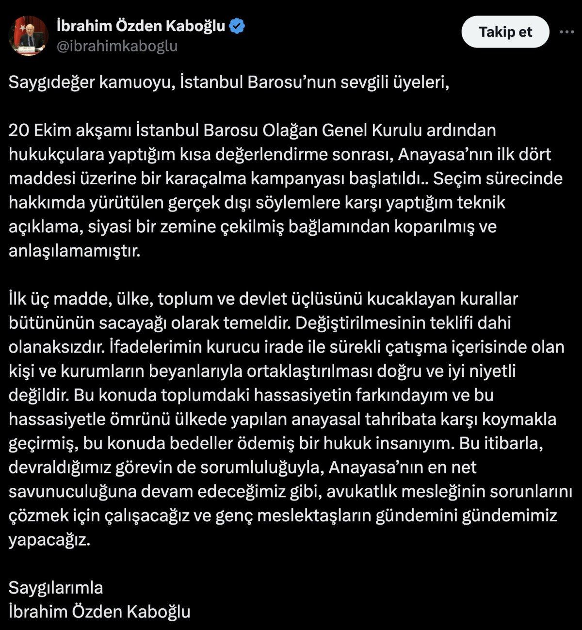 20 Ekim akşamı İstanbul Barosu Olağan Genel Kurulu ardından hukukçulara yaptığım kısa değerlendirme sonrası, Anayasa’nın ilk dört maddesi üzerine bir karaçalma kampanyası başlatıldı.. Seçim sürecinde hakkımda yürütülen gerçek dışı söylemlere karşı yaptığım teknik açıklama, siyasi bir zemine çekilmiş bağlamından koparılmış ve anlaşılamamıştır.