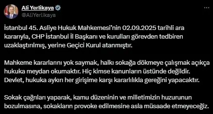 İçişleri Bakanı Ali Yerlikaya, İstanbul 45. Asliye Hukuk Mahkemesi’nin 2 Eylül 2025 tarihli ara kararıyla CHP İstanbul İl Başkanı ile İl Yönetim ve Disiplin Kurullarının görevden tedbiren uzaklaştırılarak yerine Geçici Kurul atanmasına ilişkin açıklamalarda bulundu. Yerlikaya, mahkeme kararlarını yok sayan ve halkı sokağa çıkmaya çağıran girişimlerin “hukuka meydan okumak” olduğunu vurgulayarak, “Hiç kimse kanunların üstünde değildir. Devlet, hukuka aykırı her girişime karşı kararlılıkla gereğini yapacaktır.” ifadelerini kullandı. Sokak çağrılarına da tepki gösteren Yerlikaya, “Kamu düzeninin ve milletimizin huzurunun bozulmasına, sokakların provoke edilmesine asla müsaade etmeyeceğiz.” dedi.