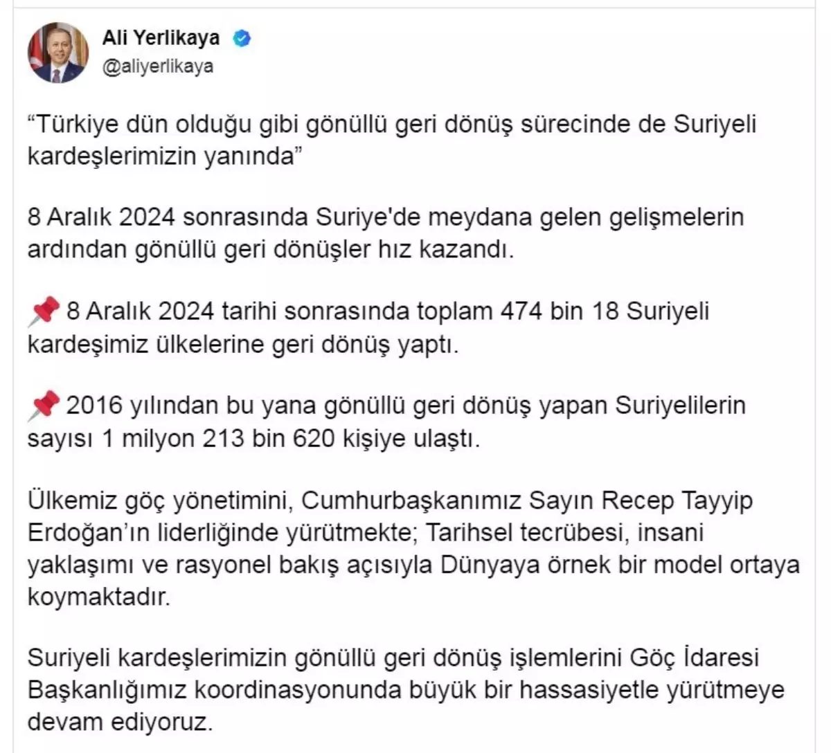 İÇİŞLERİ Bakanı Ali Yerlikaya, Suriye’deki gelişmelerin ardından gönüllü geri dönüşlerin hız kazandığını belirterek, “8 Aralık 2024 tarihi sonrasında toplam 474 bin 18 Suriyeli kardeşimiz ülkelerine geri dönüş yaptı” dedi.