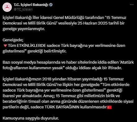 Bakanlıktan yapılan açıklamada, şu ifadeler yer aldı: “Bazı sosyal medya hesaplarında ve haber sitelerinde iddia edilen ‘Atatürk fotoğraflarının kullanımının yasak’ olduğu iddiası alçak bir iftiradır. İçişleri Bakanlığımızın 2018 yılından itibaren yayımladığı 15 Temmuz Demokrasi ve Milli Birlik Günü’ne ilişkin her genelgede ‘Tüm etkinlerde sadece Türk bayrağına yer verilmesine özen gösterilmesi’ gerektiği ibaresi yer almaktadır. Amaç, 15 Temmuz gibi milletimizin birlik ve beraberliğinin timsali olan anma gününde düzenlenen etkinliklerde siyasi partilerin değil, sadece Türk bayrağının kullanılmasıdır.”