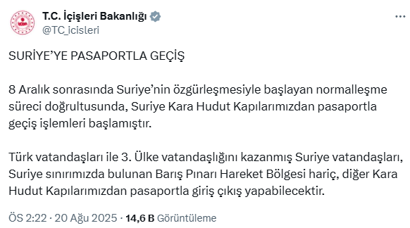 İçişleri Bakanlığı'ndan yapılan açıklamada "8 Aralık sonrasında Suriye'nin özgürleşmesiyle başlayan normalleşme süreci doğrultusunda, Suriye Kara Hudut Kapılarımızdan pasaportla geçiş işlemleri başlamıştır" ifadeleri yer aldı.