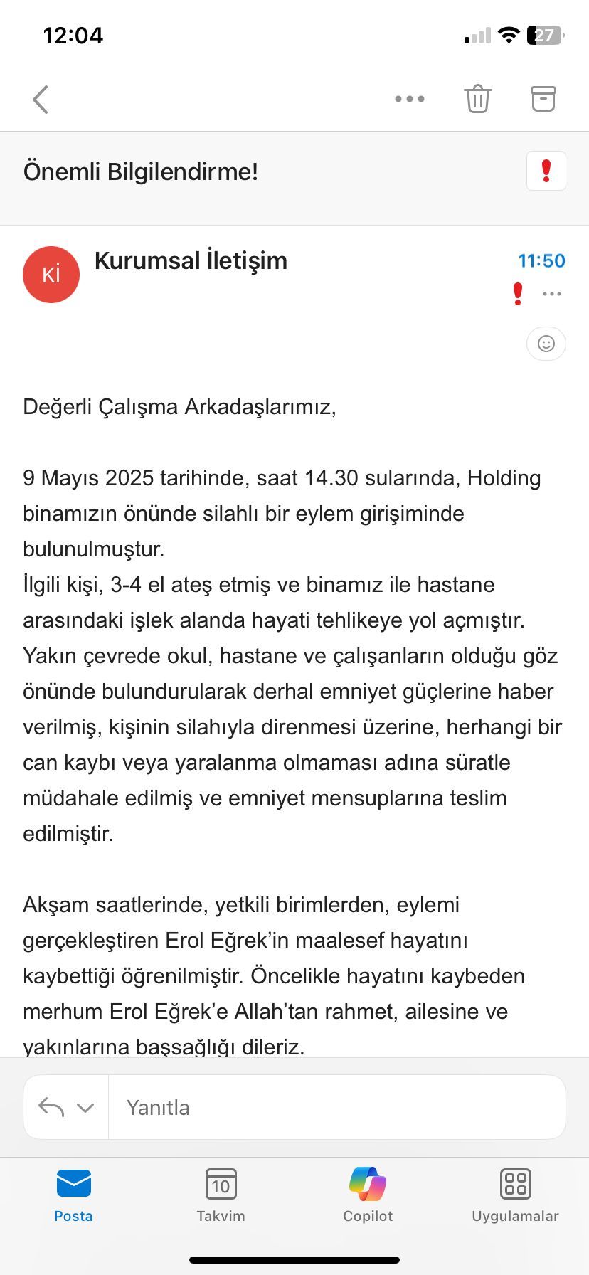 Çalık Holding ise detaylara dair net bir açıklama yapmadı. Çalışanlara gönderdiği bir mesajda ise Erol Eğrek’e rahmet dilenirken, binanın güvenlik yetkililerinin ateş açılması sonucu Eğrek’e müdahale ettiği ve etkisiz hale getirilip emniyet güçlerine teslim edildiği belirtildi.