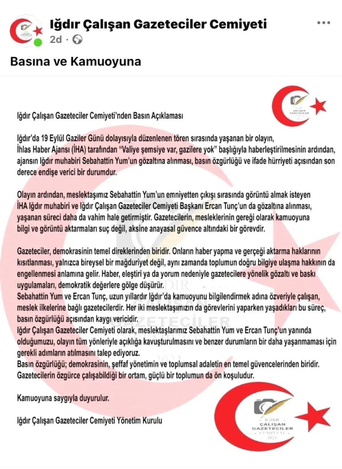 Iğdır Çalışan Gazeteciler Cemiyeti, 19 Eylül Gaziler Günü dolayısıyla düzenlenen tören sırasında yaşanan bir olayın, İhlas Haber Ajansı (İHA) tarafından “Valiye şemsiye var, gazilere yok” başlığıyla haberleştirilmesinin ardından, ajansın Iğdır Muhabiri Sebahattin Yum’un gözaltına alınması, daha sonra Yum’un emniyet müdürlüğünden çıkışını görüntüleyen İHA Iğdır Muhabiri ve Iğdır Çalışan Gazeteciler Cemiyeti Başkanı Ercan Tunç’un da gözaltına alınmasına tepki gösterdi.