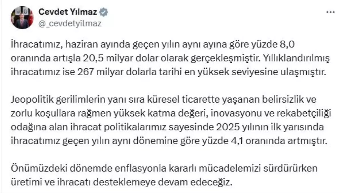 Cumhurbaşkanı Yardımcısı Cevdet Yılmaz, sosyal medya hesabından yaptığı açıklamada, “İhracatımız, haziran ayında geçen yılın aynı ayına göre yüzde 8 oranında artışla 20,5 milyar dolar olarak gerçekleşmiştir. Yıllıklandırılmış ihracatımız ise 267 milyar dolarla tarihi en yüksek seviyesine ulaşmıştır. Jeopolitik gerilimlerin yanı sıra küresel ticarette yaşanan belirsizlik ve zorlu koşullara rağmen yüksek katma değeri, inovasyonu ve rekabetçiliği odağına alan ihracat politikalarımız sayesinde 2025 yılının ilk yarısında ihracatımız geçen yılın aynı dönemine göre yüzde 4,1 oranında artmıştır. Önümüzdeki dönemde enflasyonla kararlı mücadelemizi sürdürürken üretimi ve ihracatı desteklemeye devam edeceğiz” ifadelerini kullandı.