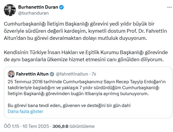 Duran göreve gelmesinin ardından X hesabından bir mesaj paylaştı. Fahrettin Altun’un mesajını alıntılayan Duran açıklamasında “Cumhurbaşkanlığı İletişim Başkanlığı görevini yedi yıldır büyük bir özveriyle sürdüren değerli kardeşim, kıymetli dostum Prof. Dr. Fahrettin Altun’dan bu görevi devralmaktan dolayı mutluluk duyuyorum. Kendisinin Türkiye İnsan Hakları ve Eşitlik Kurumu Başkanlığı görevinde de aynı başarılarla ülkemize hizmet etmesini canı gönülden diliyorum” ifadelerini kullandı.