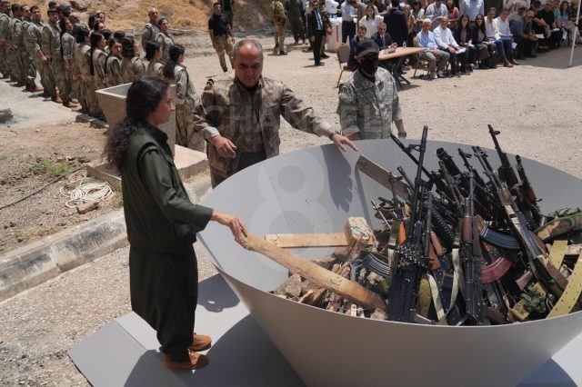 MHP Genel Başkanı Devlet Bahçeli’nin çağrısıyla başlayan “Terörsüz Türkiye” sürecinde tarihi bir gün yaşanıyor. Terör örgütü PKK’nın silah bırakma töreni kapsamında, 4’ü elebaşı olmak üzere 30 PKK’lı silahlarını yaktı. Casene Mağarası’ndaki sembolik törene ait fotoğraflar da yayımlandı.