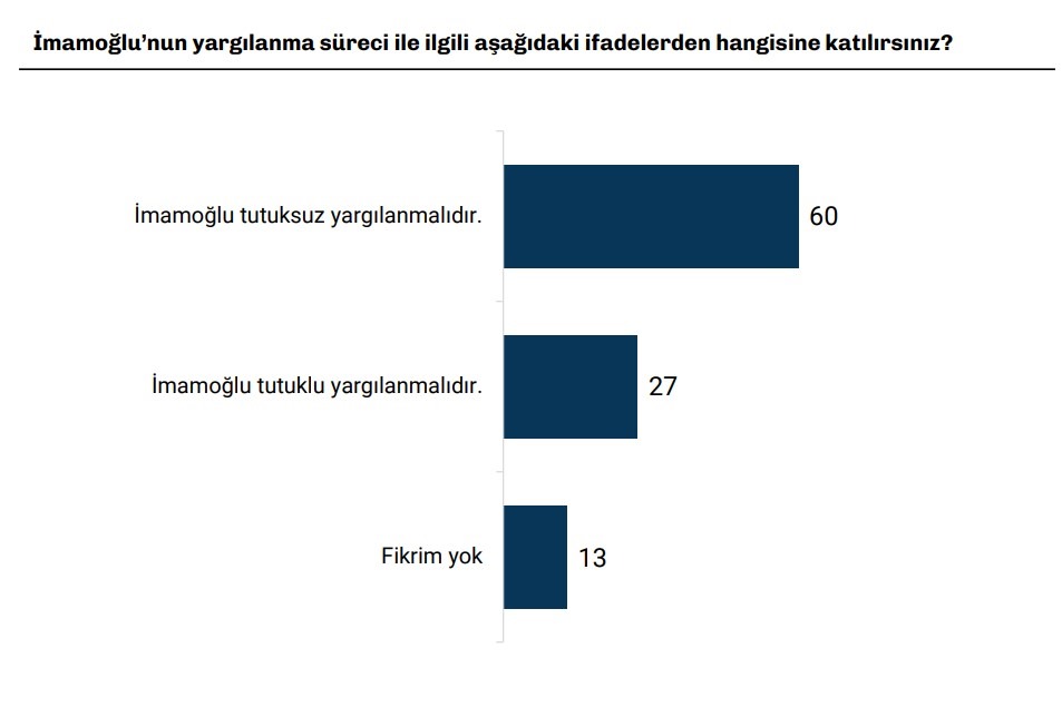 Konu hakkında araştırma yapıldı. Türkiye Raporu’nun 2-6 Mayıs tarihleri arasında 2 bin kişi ile yaptığı araştırma sonuçlarına göre katılımcıların yüzde 60’ı İmamoğlu’nun tutuksuz yargılanması gerektiğini düşünüyor. İmamoğlu’nun tutuklu yargılanması gerektiğini düşünenlerin oranı ise yüzde 27 oranında.